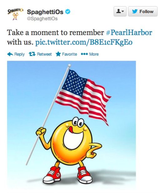 Here’s the context. While on Daly’s late night NBC talk show, they were discussing the funniest stories of 2013. The subject of the much talked about SpaghettiOs’/Pearl Harbor tweet came up. For those of you who don’t recall, there was a bit of a dust up when someone at Cambell’s Soup, the owner of the brand, posted this tweet: