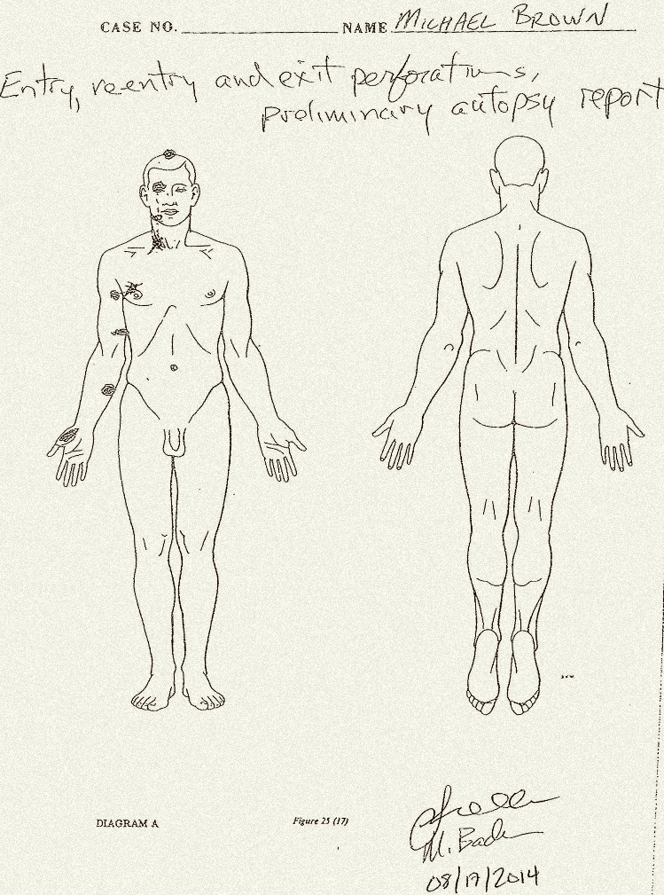 To a forensic pathologist, the body diagram Brown’s attorneys released tells a different story. The wound at the top of the head, the frontal wounds and angled right hand and arm wounds suggest that the victim was facing the officer, leaning forward with his right arm possibly extended in line with the gun’s barrel, and not above his head. The image of a person standing upright with his hands in the air when he was shot does not appear compatible with the wounds documented on that diagram. Whether a forward-leaning position is a posture of attack or of surrender, however, is a matter of perspective. (“What Michael Brown’s autopsy tells us” By Judy Melinek M.D., CNN; Aug. 21, 2014)