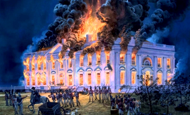 1814 – British forces capture Washington DC, set fire to the Capitol and the President’s Mansion (now called the White House), the only time the city has been occupied by a foreign force. Dolley Madison organized the household staff and slaves of the presidential residence to save valuables as the British were entering the city.
