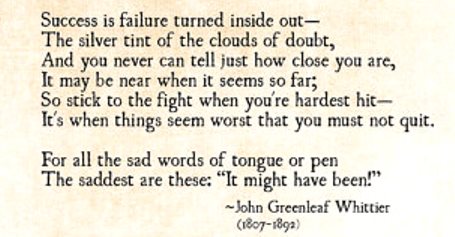 - John Greenleaf Whittier quote from his poem “Don’t Quit”