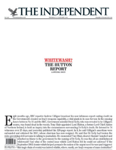 The public and media reception of the Hutton Inquiry’s findings is best described as skepticism laced with incredulity. Lord Hutton did enjoy the reputation as an impartial judge, but the manifest contradictions in the specific findings versus the holding was a hard pill for many to swallow. The aftermath of the findings included three resignations from the BBC (including Gilligan) and a host of condemnation in the press. One notable headline at the time was found on The Independent.