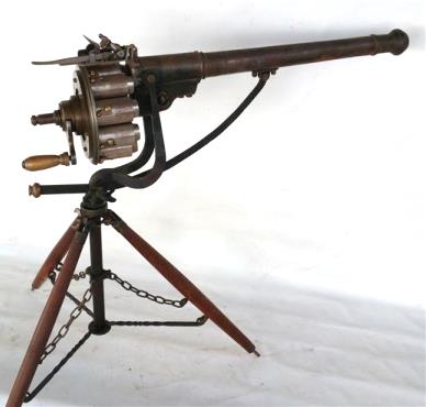 1718 – James Puckle, a London lawyer, patents the Defense Gun, a tripod-mounted, multi-shot weapon capable of firing up to 9 rounds per minute – it resembles a large revolver, and is meant for shipboard use to repel boarders