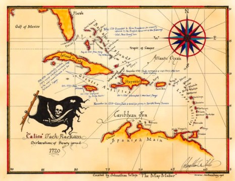 1720 – Pirate Captain “Calico Jack” Rackham is captured at Bry Harbour Bay, Jamaica; his ship flies a distinctive ‘Jolly Roger’ flag with a skull above crossed swords, and Anne Bonny and Mary Read are among his ship’s crew