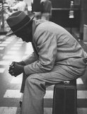 - Man sitting on suitcase in 1960s San Francisco