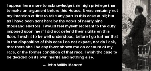 1869 – When John W. Menard speaks in Congress in defense of his claim to a contested seat in Louisiana’s Second Congressional District, he becomes the first black person to make a speech in the House of Representatives. Congressmen decided against both claimants. Congressman James A. Garfield of the examining committee said “it was too early to admit a Negro to the U.S. Congress.”