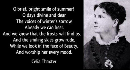 1835 – Celia Thaxter born, American poet and short story writer; she was married at sixteen. During a period of separation from her husband, she returned to her father’s hotel, the Appledore House, in the Isles of Shoals off the coast of Maine in 1861, where she was the hotel’s hostess, welcoming notable literary figures of the day like Ralph Waldo Emerson, Nathaniel Hawthorne, Henry Wadsworth Longfellow, John Whittier, and Sarah Orne Jewett, and artists William Morris Hunt and Childe Hassam. Her first book of poems, Driftwood, was published in 1879, when she also reunited with her husband, moving into a house they had built at Kittery Point, Maine. She died suddenly in 1894, while on a visit to Appledore House; noted for Among the Isles of Shoals, several poetry collections, and her account of “A Memorable Murder” that happened when she was present on nearby Smuttynose Island