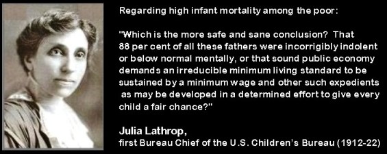 1858 – Julia Lathrop born, American social reformer, activist and civil servant; met Jane Addams and Ellen Gates Starr at school, later worked with them and others at Hull House; first woman member appointed to Illinois State Board of Charities, where she advocated for improving social services, and introduced reforms like appointing women doctors to positions in state hospitals, and moving the insane out of state workhouses. She was appointed by President Taft as the first woman to head a United States federal bureau, as first bureau chief of the newly formed United States Children’s Bureau (1912-1922), where she directed research into child labor, infant mortality, maternal mortality, juvenile delinquency, mothers’ pensions and illegitimacy, and not only created child welfare policy but implemented it, one of the earliest opportunities for an American woman to have a active role in government policy-making and creation of regulations