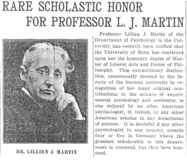 1851 – Lillien J. Martin born, American psychologist, author of over 12 books, including Salvaging Old Age, and Sweeping the Cobwebs; graduated from Vassar in 1880; refused admission to the University of Bonn because of her gender, she studied at the University of Göttingen (1894-1898). Martin taught psychology at Stanford University (1899-1916). In 1913, the University of Bonn awarded her an honorary doctorate. After she left Stanford, Martin became a consulting psychologist and psychopathologist in San Francisco, where she was the head of the world’s first mental health clinic specifically for elderly people and non-handicap children. She was president of the California Society for Mental Hygiene