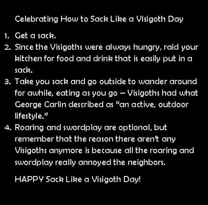 2017 – Sack Like a Visigoth Day * is inaugurated – if you love Talk Like a Pirate Day, this one’s right up your alley (see also year 410 entry) – How to play along: