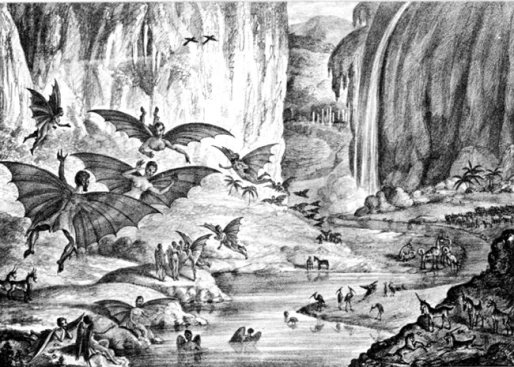 1835 – “The Great Moon Hoax” – The New York Sun runs a satirical series, “reprinted” from the long-defunct Edinburgh Journal of Science, claiming sightings through a telescope of life on the moon, including unicorns, two-legged beavers, bat-like humanoids, rushing rivers and lush vegetation. Most readers believe the stories are true, including some scientists from Yale University, who show up at the Sun wanting to see the “science journal”