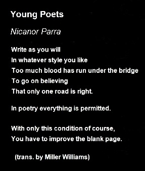 1914 – Nicanor Parra born, Chilean poet, mathematician, and physicist; studied physics at Brown University in U.S. and cosmology at Oxford; taught theoretical physics in Santiago; published Poemas y Antipoemas in 1954, which became one of the most influential Spanish-language poetry collections in the 20th century