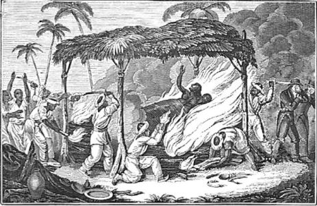 Engraving of the burning of an Indian widow, from a book by Reverend James Peggs
