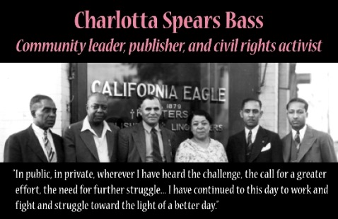 1874 – Charlotta A. Spears Bass born, newspaper publisher and civil rights activist, works for the California Eagle newspaper in Los Angeles (1904-1951), taking over after the owner/editor dies – by 1925 it is the West Coast’s largest Black newspaper, circulation 60,000; first African American woman U.S. Vice Presidential candidate when the Progressive Party chooses her as their nominee