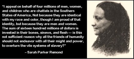 1826 – Sarah Parker Remond born, African-American abolitionist, inspiring orator, American Anti-Slavery Society agent in England during Civil War, gathers support for anti-slavery cause and the Union Army, later moves to Italy and becomes a physician
