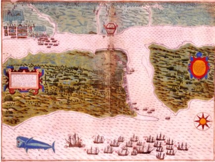Sir Francis Drake’s fleet attacking St. Augstin, Spanish Florida – 1586