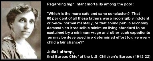 1858 – Julia Lathrop born, American social reformer, activist and civil servant; met Jane Addams and Ellen Gates Starr at school, later worked with them and others at Hull House; first woman member appointed to Illinois State Board of Charities, where she advocated for improving social services, and introduced reforms like appointing women doctors to positions in state hospitals, and moving the insane out of state workhouses. She was appointed by President Taft as the first woman to head a United States federal bureau, as first bureau chief of the newly formed United States Children’s Bureau (1912-1922), where she directed research into child labor, infant mortality, maternal mortality, juvenile delinquency, mothers’ pensions and illegitimacy, and not only created child welfare policy but implemented it, one of the earliest opportunities for an American woman to have a active role in government policy-making and creation of regulations