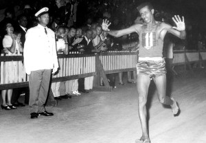 Abebe Bikila winning the marathon in the 1960 Rome Olympics