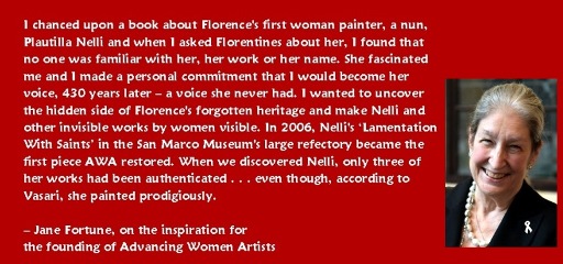 1942 – Jane Fortune born, American author, journalist, women’s art expert and philanthropist; she was the cultural editor of The Florentine, an English-language newspaper in Tuscany (2005-2018), and wrote Mosaics, a column which led to publication of her guidebook, To Florence, Con Amore: 77 Ways to Love the City (expanded in the second edition to 90 Ways to Love the City). She spent many years tracing, documenting, and fighting to preserve, restore and promote the women artists of the city. She wrote Invisible Women: Forgotten Artists of Florence, published in 2009, and co-authored with Linda Falcone, Art by Women in Florence: A Guide through Five Hundred Years (2012), which details where the work of women artists may be viewed in the public collections of Florence. She founded the Italian nonprofit, The Florentine Committee of the National Museum for Women in the Arts in 2005, and in 2009, she founded the American nonprofit, Advancing Women Artists Foundation (AWA), to research, restore and exhibit art works by woman artists. Since AWA’s founding, over sixty restoration projects have been completed for drawings, paintings and sculpture, concentrating on Florentine women artists, from the 16th through the 19th centuries, but also work by 19th century French sculptor Félicie de Fauveau. AWA also sponsors the Nelli Awards, given to modern women artists, curators, and restorers working in Florence. Initially, she funded the restoration of a painting in the San Marco Museum, Lamentation with Saints, a large-scale Renaissance painting by Suor Plautilla Nelli, Florence’s earliest recognized woman painter to date. In 2008, David and Bathsheba, by Baroque painter Artemisia Gentileschi was restored. In 2015, the city of Florence bestowed on her its highest honor, the Fiorino d’Oro. After Fortune died of cancer at home in Indianapolis in 2018, at the age of 76, a memorial mass was held for her at the Basilica of Santa Croce in Florence