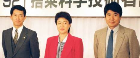 Mamoru Mohri (L) Chiaki Mukai (C) and Takao Doi (R)