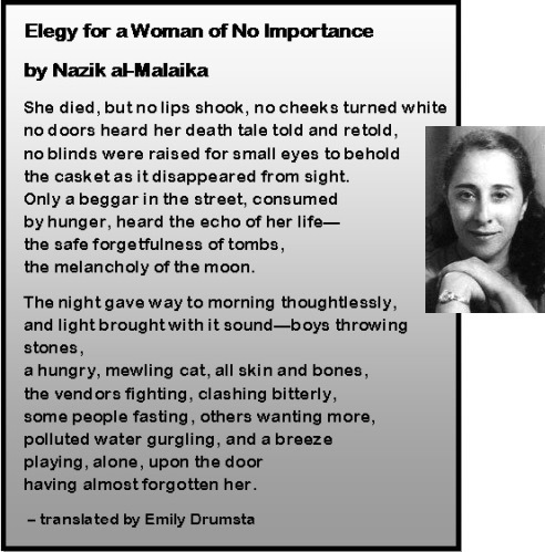 1922 – Nazik Al-Malaika born to a feminist poet mother and academic father, Iraqi poet, one of the most influential women poets in Iraq. Notable as the first Arabic poet to use free verse, in her ground-breaking second book of poetry, Sparks and Ashes. Her poems covered nationalism, social and feminist issues, honour killings and alienation. She left Iraq with her husband and family in 1970 after the Arab Socialist Ba’ath Party came to power, moving to Kuwait, until it was invaded by Saddam Hussein in 1990, and then to Egypt, where she lived for the rest of her life in Cairo. Her other three books of poetry are And the sea changes its colour, Bottom of the Wave, and The Night’s Lover