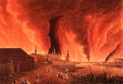 1812 –As Napoleon’s army occupies the city, Moscow blazes for four days, destroying almost 75% of the buildings. Cause is disputed, but incendiarists interrogated by the French say they were under orders to burn “everything”