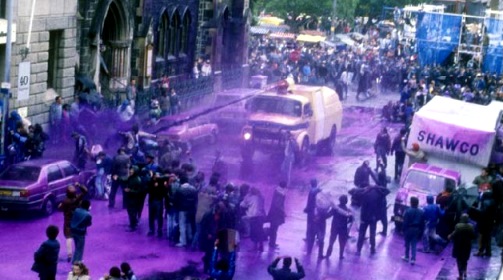 1985 – South Africa ‘Purple Rain’: After marchers, most of them women wearing t-shirts with the slogan “Troops Out,” reached the Cape Town city centre to protest troops being permanently stationed in townships, and refused to obey an order to disperse, Cape Town police used water cannons to spray purple-dyed water on them, setting off a riot