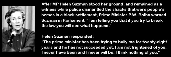 1917 – Helen Suzman born, South African politician and anti-Apartheid activist; Member of the South African Parliament for Houghton (1953-1989), where she used every opportunity to speak out against discriminatory legislation and to defend the right of freedom of expression for all South Africans. She was a founding member of the Progressive Party in 1959, and its sole representative in parliament for the next 16 years. She visited prisons to inspect living conditions of prisoners, including those on Robben Island, and met with Nelson Mandela several times. Her reports improved prison conditions for several ANC prisoners, and she used her parliamentary privilege to evade government censorship, and pass information about the worst abuses of apartheid to the media. She was frequently reviled and derided as a Jew and as a woman by other members of Parliament and by Prime Minister P.W. Botha, both in Parliament and in the government-controlled press. Suzman was once accused by a minister of asking questions in parliament that embarrassed South Africa, to which she replied: “It is not my questions that embarrass South Africa; it is your answers.” The UN honored her with its Human Rights Award in 1978, and the Medallion of Heroism in 1980, and she was twice nominated for the Nobel Peace Prize
