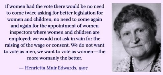 1849 – Henrietta Muir Edwards born, one of Canada’s “Famous Five” who fought and won the battle for legal recognition of women as persons and citizens. During WWI, she became the first woman in Canada to serve on an advisory committee to the Canadian government, formed to suggest ways of increasing the effectiveness of wartime conservation measures. She was the chair of the National Council of Women of Canada’s committee for Laws Governing Women and Children for 35 years, where she campaigned for recognition of women’s dower and matrimonial property rights. She also co-founded a Working Girl’s Association in Montreal to provide meals, reading rooms and study classes, which became one of the first YWCAs in Canada, and published the periodical Working Women of Canada. Edwards was the author of the authoritative Legal Status of Canadian Women (1908). In 1962, the Canadian government recognized Edwards as a Person of National Historic Significance, and in 1997, recognized the “Persons Case” as a Canadian Historic Event. In 2009, the Canadian Senate voted to name the “Famous Five” as Canada’s first “honorary senators.”