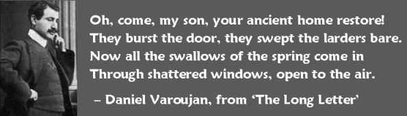 1884 – Daniel Varoujan born, Armenian poet; in 1914 he founded the Mehean literary group and magazine, with four other Armenian writers, aiming to start an Armenian literary revival. In 1915, he and four other Armenians, including Dr. Roupen Sevag, were arrested and jailed, then told they were being moved to another place. On the way, a Turkish official and his assistant, accompanied by five heavily armed men, stopped the convoy. Witnesses in hiding reported that after robbing the prisoners, the official told the armed men to take the prisoners into the woods, where they were stripped of the clothes, tied to trees and cut slowly with knives to bleed to death. Varoujan’s unfinished poetry collection, The Song of the Bread, was confiscated, but was reportedly saved by bribing Turkish officials, and published posthumously in 1921