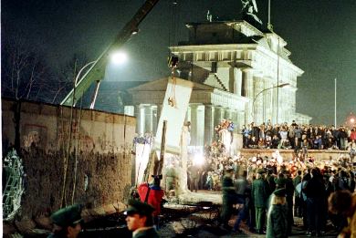 1990 – Wrecking cranes began tearing down the Berlin Wall at the Brandenburg Gate