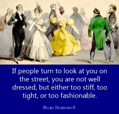 1778 – ‘Beau’ Brummell, born George Bryan Brummell, English dandy and wit; friend of the Prince Regent, the arbiter of fashion; under his sway, men in high society avoid bright colors, ornate accessories, and improve their daily grooming habits. He brings long pants, starched cravats, and black evening dress into fashion: his black-and-white evening ensemble evolves into the tuxedo, still worn for formal occasions today