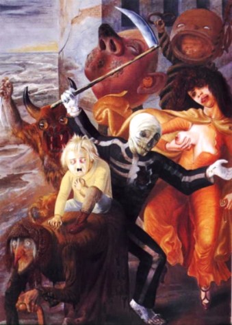 added by Dix after the painting was first exhibited); death is Sloth, representing the German people dragging their feet in acknowledging the Nazi danger; Anger is the red demon; Pride is
