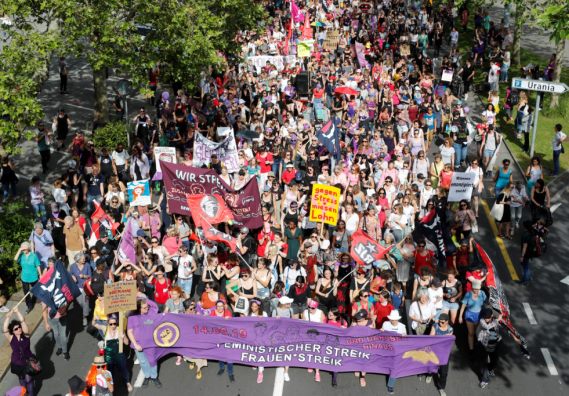 2019 – Tens of thousands of Swiss women walked out of their jobs or took part in work stoppages, part of a nation-wide strike in protest of the gender pay gap and women’s inequality. In Basel, a crowd of 50,000 women, many wearing the movement’s signature purple, carried signs with demands for equal pay, denunciation of feminicide, sharing of domestic and care work, non-sexist education in schools, and fulfilled sexuality. They gathered in front of a display of posters showing heroic women of Basel who have led protests since the Middle Ages. There were large street demonstrations in every Swiss city which were cheerful, colourful and noisy.