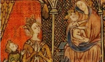 Detail from a tapestry: Yolande of Aragon with the Virgin Mary and infant Jesus