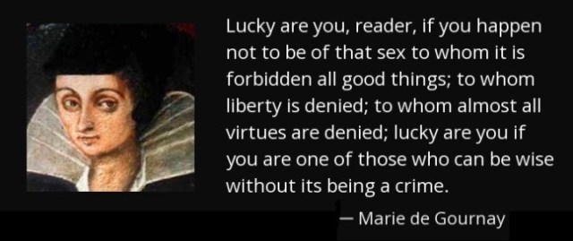 1565 – Marie de Gournay born, French protofeminist writer; noted for The Equality of Men and Women (1622) and The Ladies’ Grievance (Les femmes et Grief des dames, 1626); she was an advocate for women’s education
